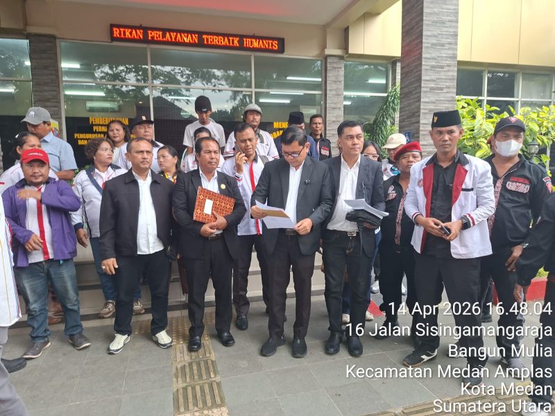 Bishop Diskon Panjaitan, STh, M.Div didampingi Ketua Umum Horas Banget Batak ( HBB) Beserta Pemuda Peduli Nias, Pemuda Marga Silima ( PMS), dan Aliansi masyarakat Sumatra Utara Secara Resmi Melaporkan JK di Sentra Pelayanan Kepolisian Terpadu (SPKT) Polda Sumatra Utara. 14/04/2026.