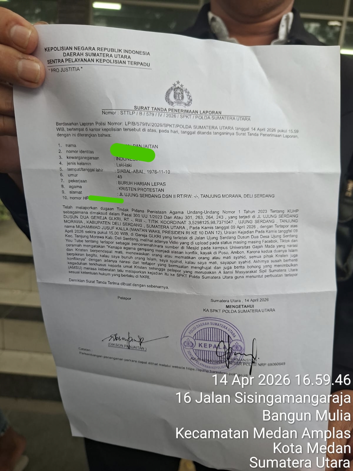 “Kami dari Aliansi masyarakat sipil Sumatra Utara datang untuk melaporkan Bapak Jusuf Kalla Atas Dugaan penistaan Agama Kristen. Kehadiran kami juga didukung beberapa organisasi masyarakat Seperti Horas Bangso Batak, Pemuda Peduli Nias dan Pemuda marga silima,” kata Bishop Diskon Panjaitan 14/04/2026.